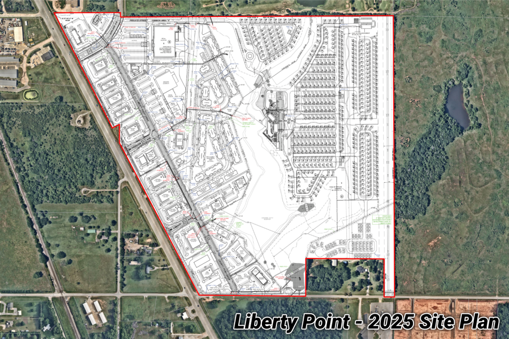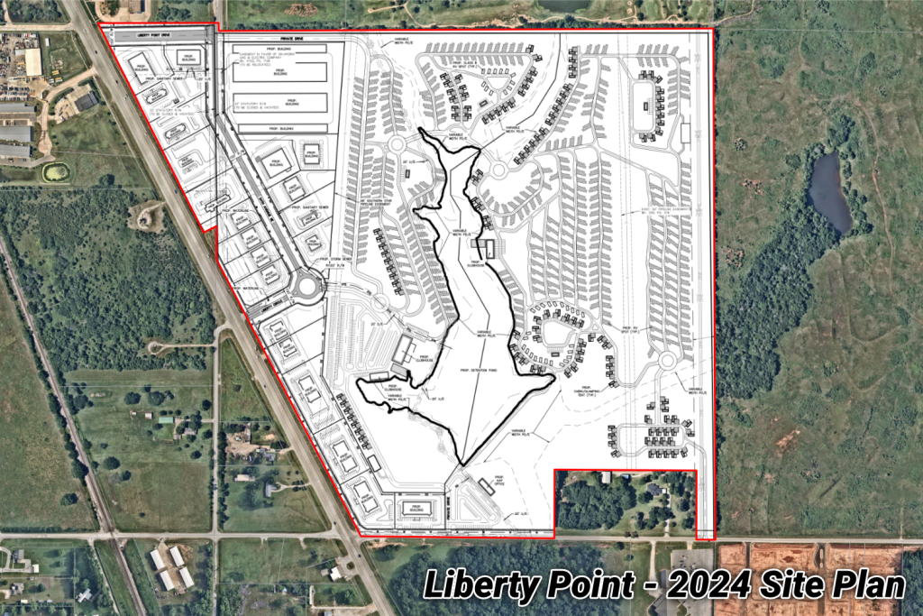24th Avenue was originally planned to be re-routed further south through the development. In the new scheme, 24th Ave is curved to Classen Boulevard toward the North side of the development. A new street, Liberty Point Drive, connects to 24th Avenue on the North side and parallels Classen Boulevard with two connections to Classen Boulevard.